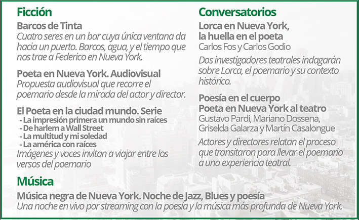Entre el 22 y el 28 de noviembre, un conjunto de grupos artísticos, con el impulso de los centros culturales La Calle Larga de Avellaneda y Justo Lynch de Wilde, conmemorarán los 8o años del poemario Poeta en Nueva York del gran poeta español Federico García Lorca. Será una actividad audivisual titulada «Yo denuncio» en la cual WhatsApp, Facebook e Instagram servirán de base para el despliegue de una diversidad de contenidos que incluirán ficciones, conversatorios en vivo, música y poesía. Será «una aventura poética, artística y provocativa que interpela al espectador a mirar a la sociedad en la que vivimos como lo haría Federico (…) una invitación a rebelarse ante lo injusto», dicen los organizadores. Y fundamentan: «¿Por qué Poeta en Nueva York hoy? La dramática descripción que hace el poeta a principios de siglo XX la podríamos hacer hoy al respecto de muchas ciudades del planeta. La verdad presente en el poemario transciende fronteras geográficas y alcanza un grado universal donde se replican ciudades verticales, deshumanizadas, de magnitudes descomunales, en donde las personas son una pieza más de un mecanismo que transforma todo en mercancía. Lorca se revela y denuncia ese mundo materialista y consumista sin límites, retratándolo como una fuerza que fomenta la opresión, la desigualdad y que distancia a los humanos de la naturaleza y, además, de su propia condición humana».