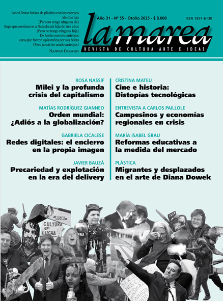 Poesía: Najwan Darwish (Palestina) | Reconfiguración del orden mundial: ¿Adiós a la globalización?, por Matías Rodríguez Gianneo | Acerca de las ultraderechas actuales: Milei y la crisis del capitalismo en el siglo XXI, por Rosa Nassif | El condicionamiento de la redes digitales en la interacción cotidiana: Enredándonos en nuestra propia imagen, por Gabriela R. Cicalese | Nuevas formas del control social en tiempos del Big Data: ¿El algoritmo es el nuevo jefe? Precariedad y explotación en la era del delivery, por Javier Bauzá | Acerca de los cambios y modificaciones desde una perspectiva psicosocial: Organización del trabajo e identidad, por Nahuel Baresi | Migrantes y desplazados en la última muestra de Diana Dowek: En el espejo de una odisea | Empobrecer, precarizar y privatizar la educación pública: Reformas educativas a la medida del mercado, por María Isabel Grau | Derribo del monumento de Osvaldo Bayer: Los muertos que ustedes matan gozan de buena salud, por Roberto Balmaceda | A 50 años del Operativo Independencia: Fronterita cuenta su Historia, por Daniela Wieder y Silvia Nassif | Campesinos, chacareros y economías regionales en crisis: Pablo Paillole: “No es racha, es programa”, entrevista de Víctor Delgado | Representaciones para pensar el futuro: Distopías tecnológicas. Cine e historia, por Cristina Mateu | Revisitados: Guerras y revoluciones en los años ’60 | Y como siempre, reseñas de libros y “Marejadas” con noticias culturales | Contratapa: Camarazos en solidaridad con Pablo Grillo.