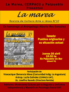 La Marea presentará su número 37 y se llevará a cabo un panel con especialistas que abordarán el contenido del número. Los panelistas invitados son la antropóloga Lucila Galíndez (cerpacu), la vicecacique Clemencia Nieva (Comunidad Indígena de La Angostura) y la directora de la La Marea, profesora Josefina Racedo. La presentación estará a cargo de la responsable del espacio cultural Palpueblo, profesora Ximena Rosich.